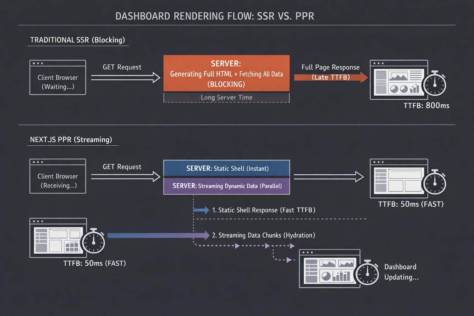 W tradycyjnym SSR jesteśmy blokowani przez konieczność wygenerowania jednego, monolitycznego pliku HTML. Dopóki serwer nie pobierze wszystkich danych, przeglądarka czeka na “pustym biegu”.